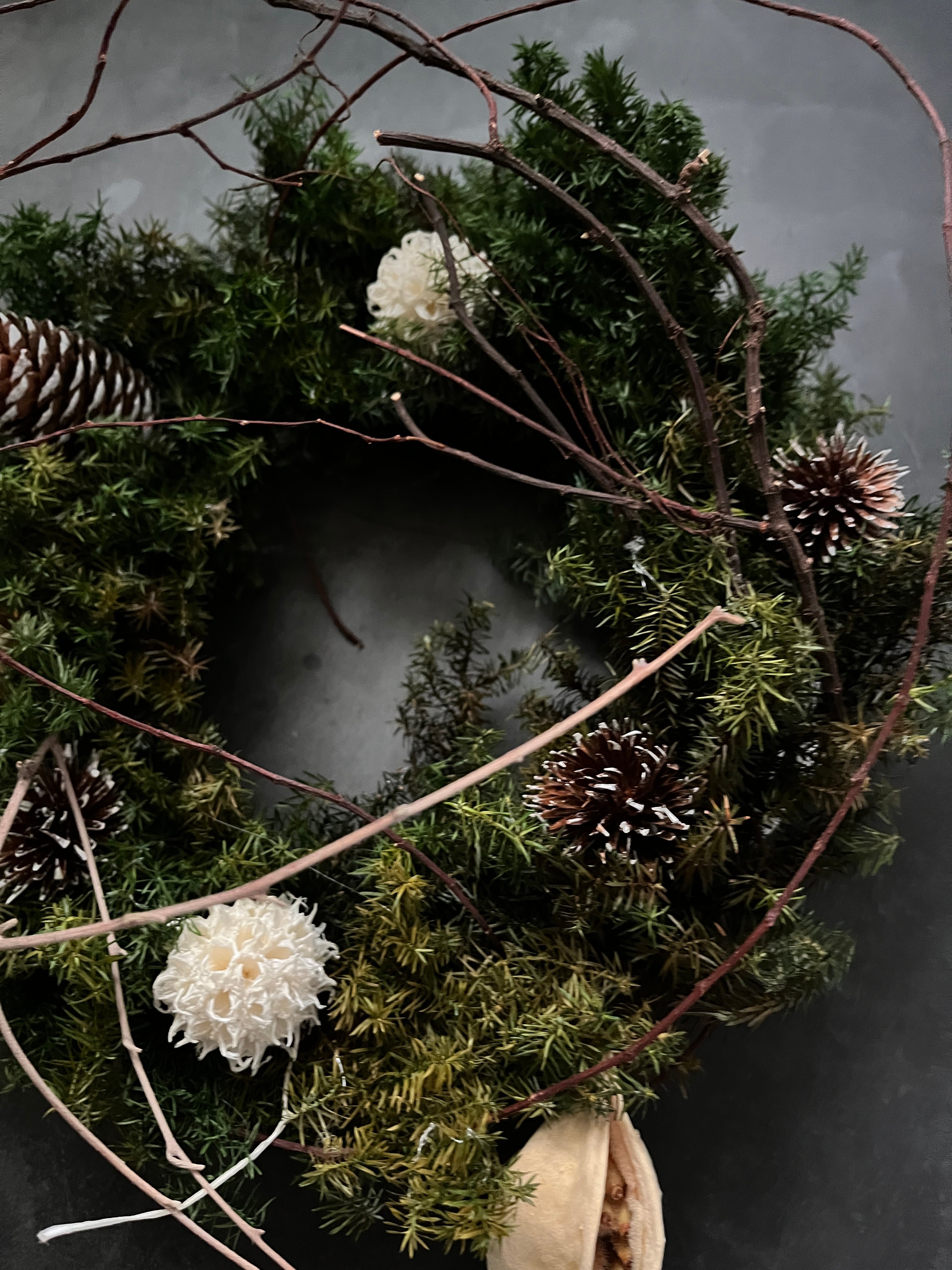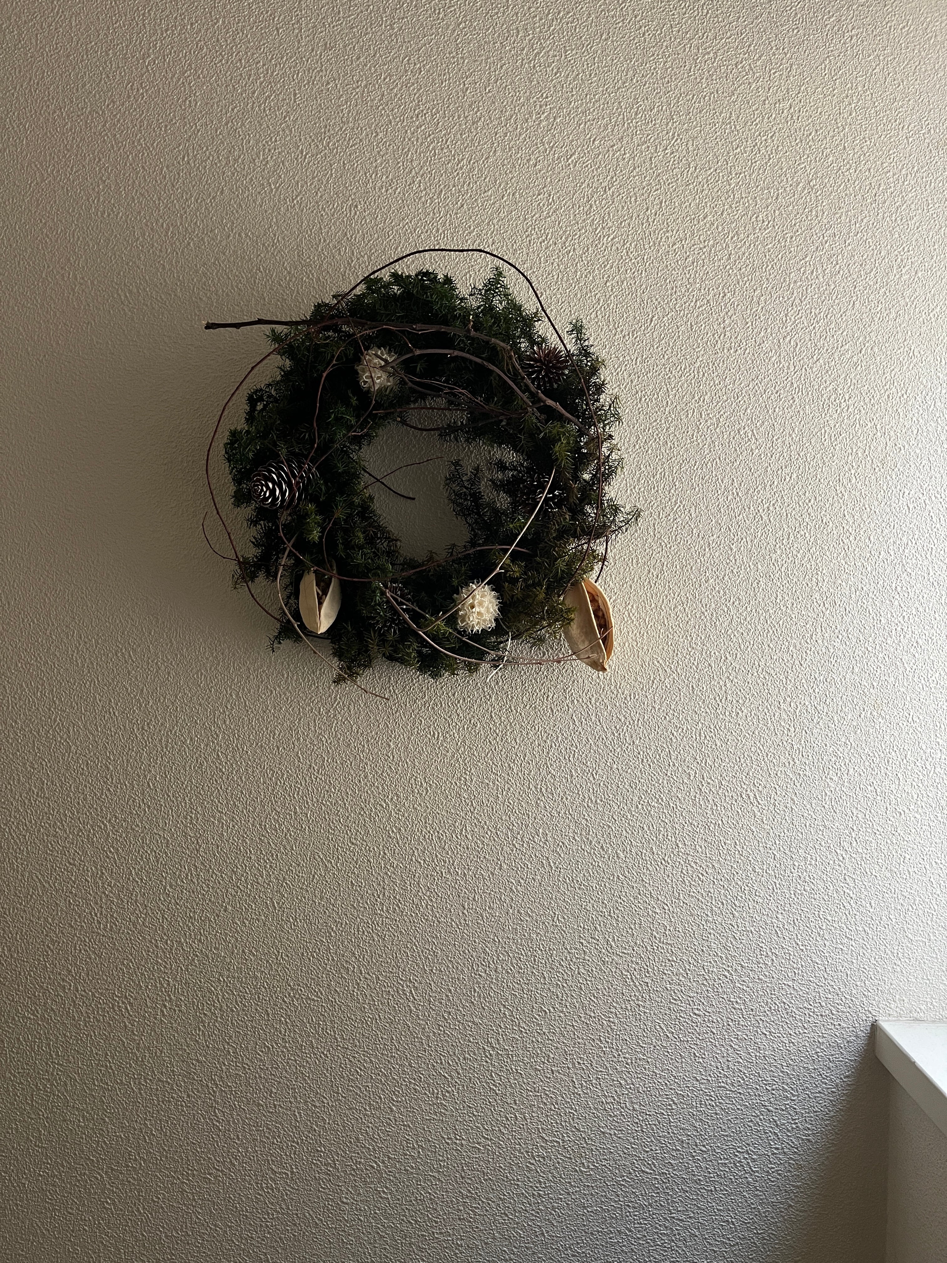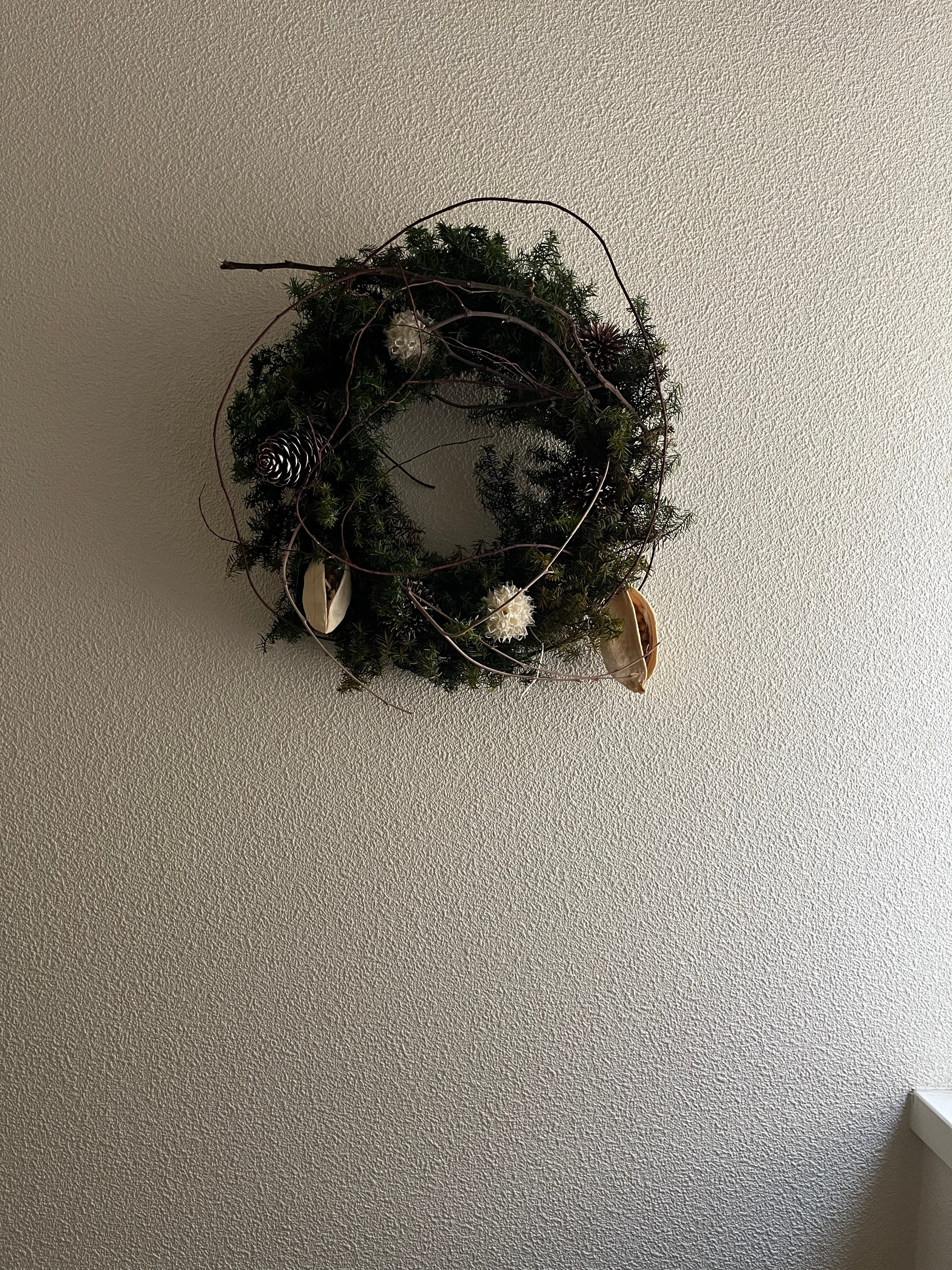ホワイトの柳のリースにヒムロスギを一枝ずつ刺してベースを