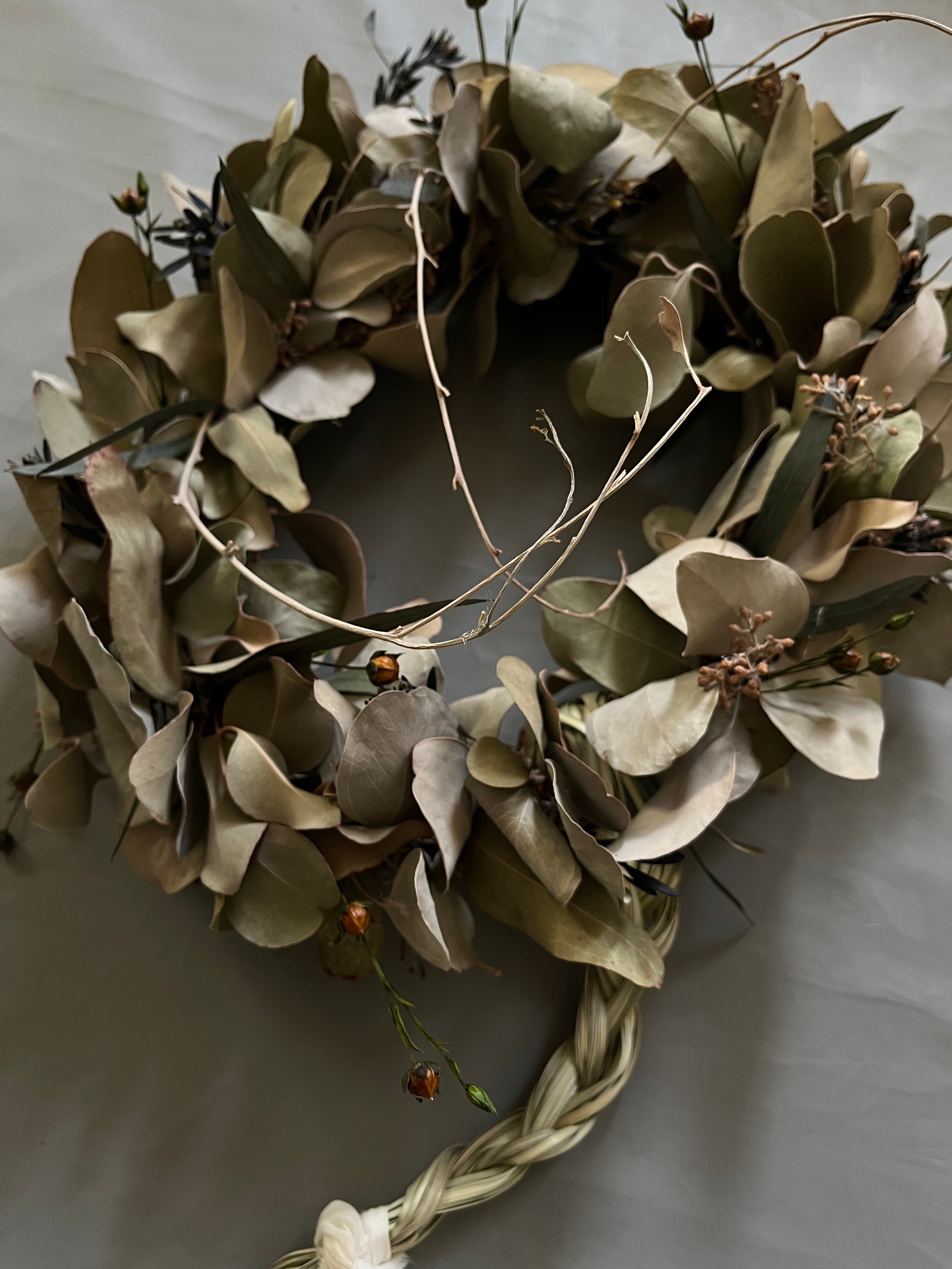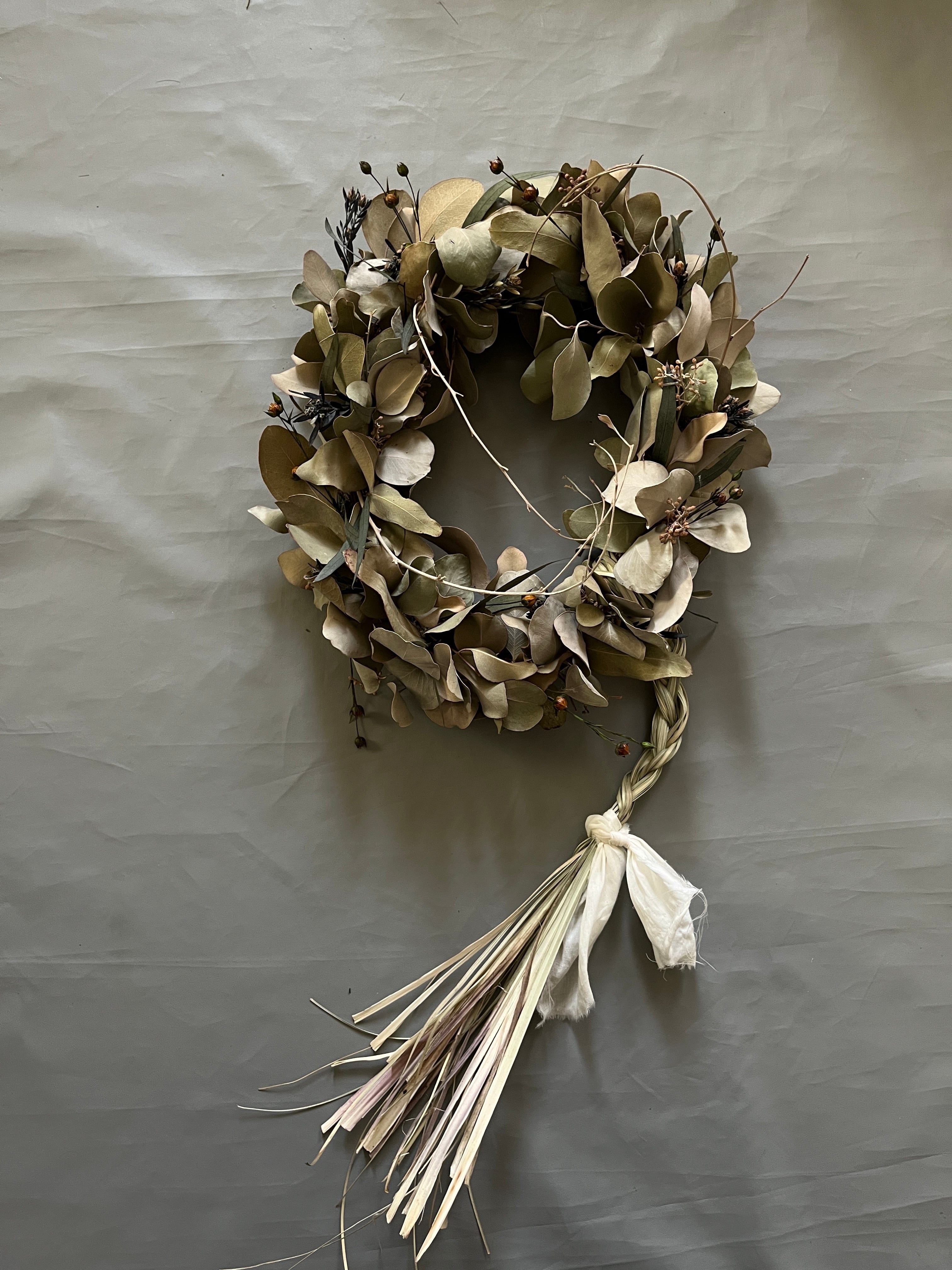 グラスの植物を編みリボンの代わりにリースから垂らしています