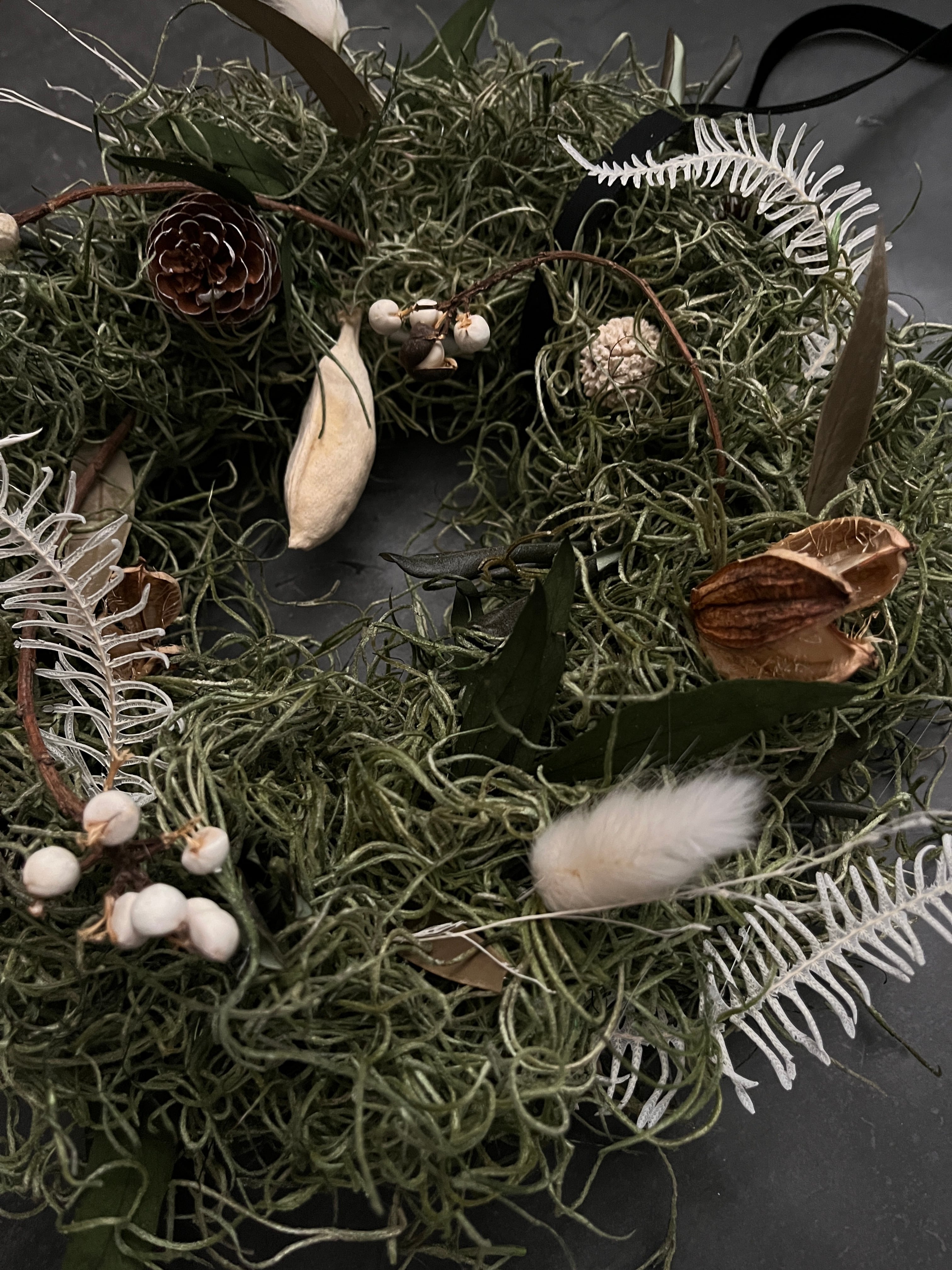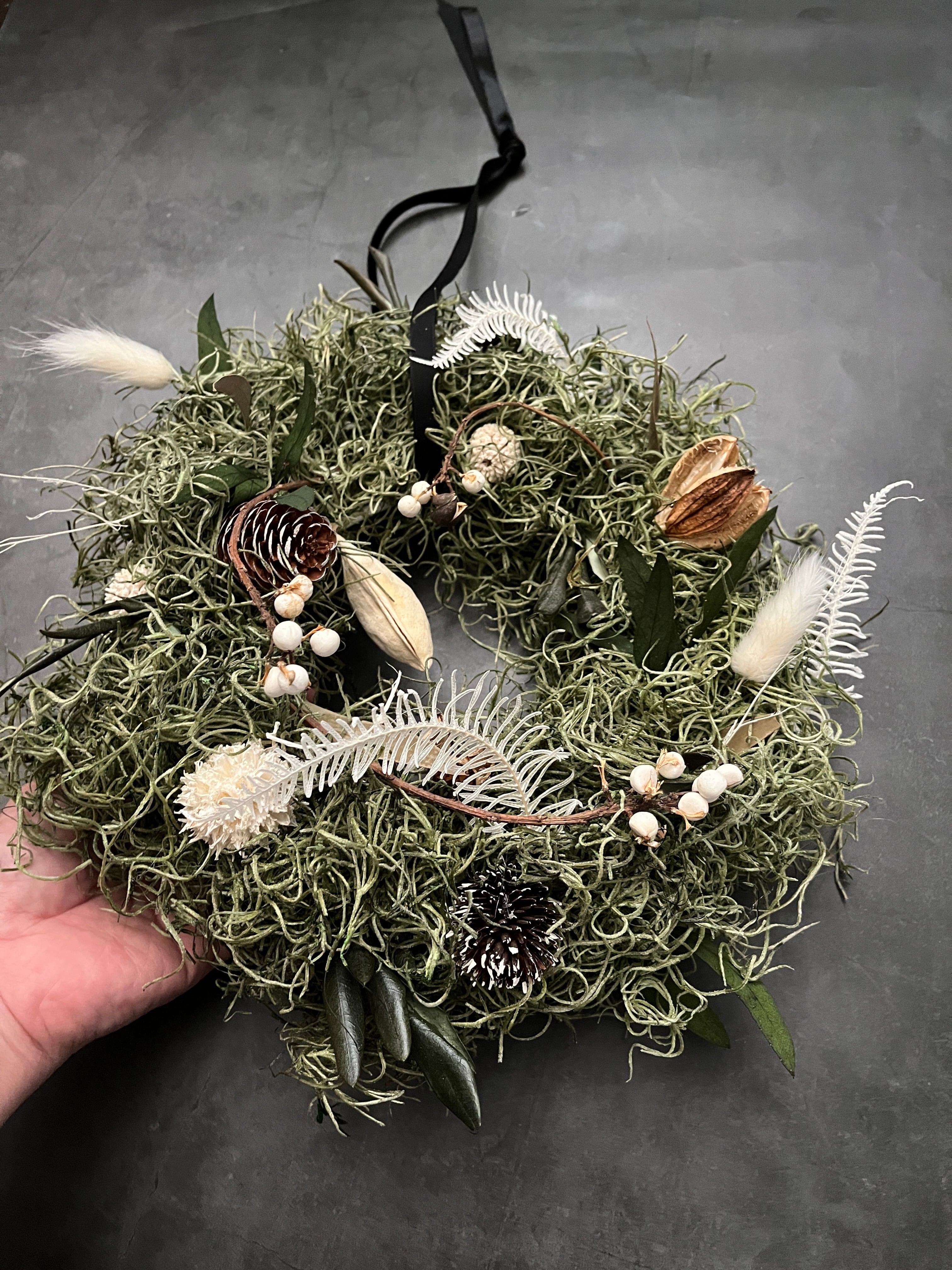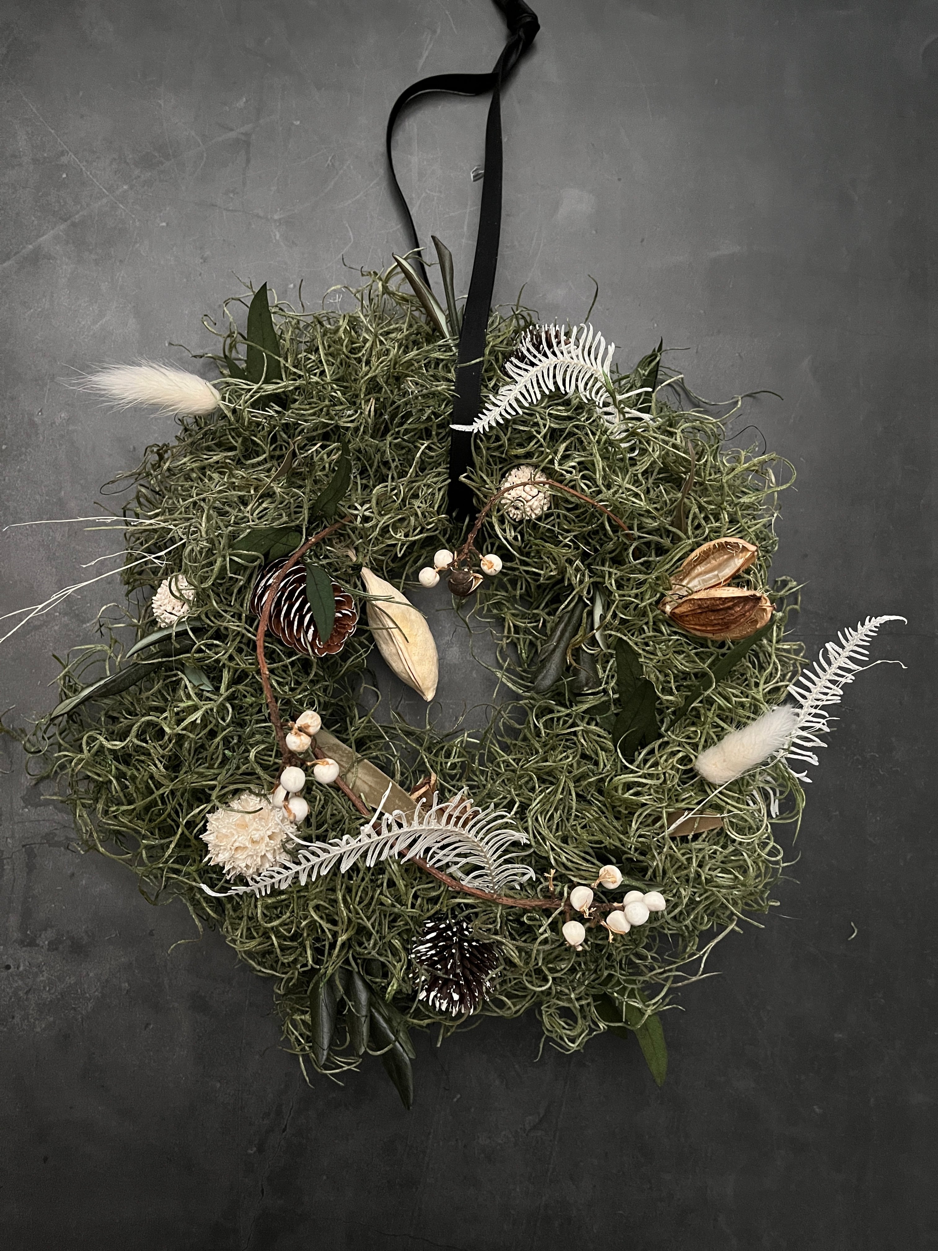 様々な植物を組み合わせたこのリースは植物の造形を楽しみつつ