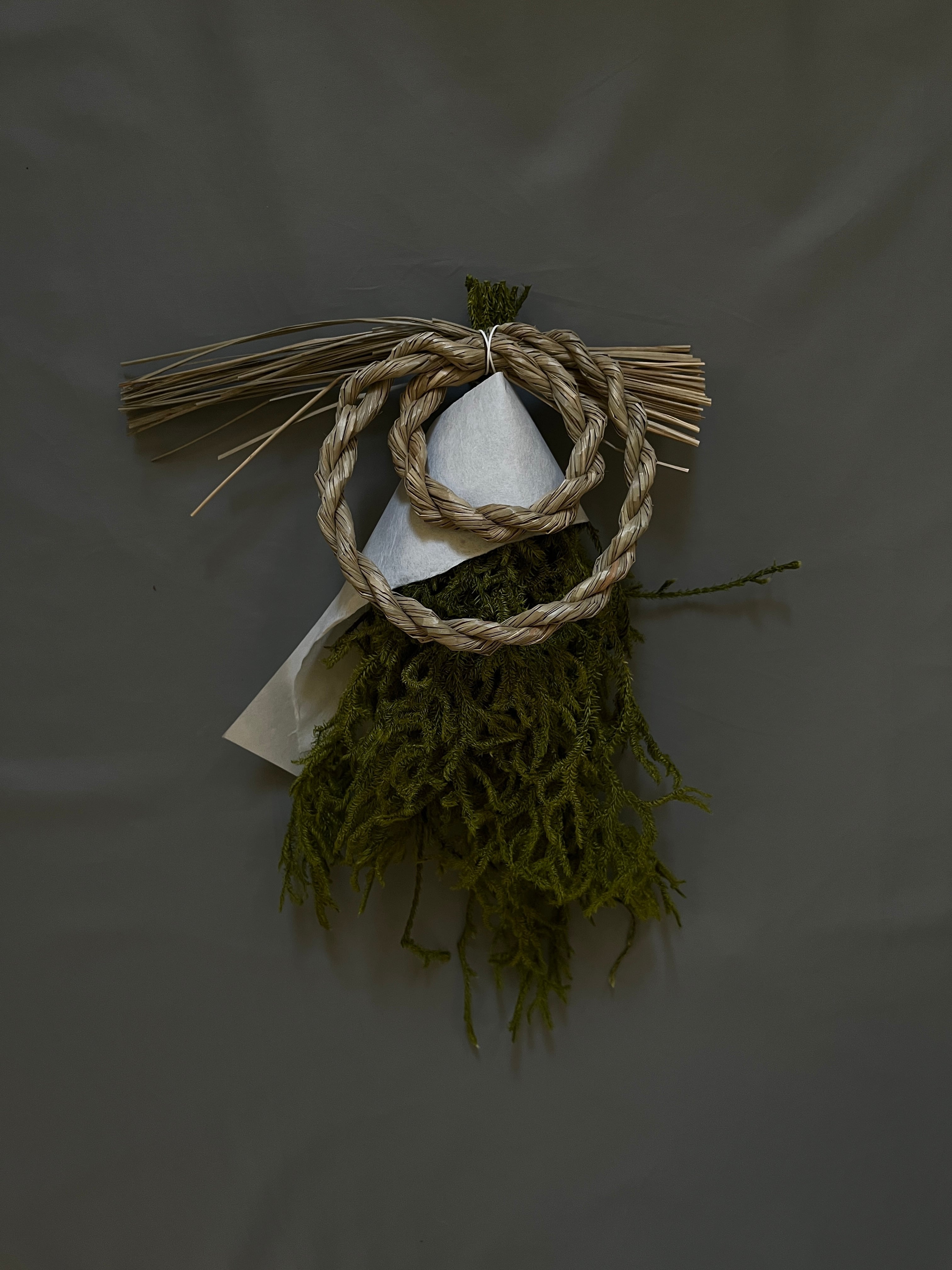 天然のグリーンと、縄の質感が絶妙なコントラストを生み出し玄関先を品良く彩ります