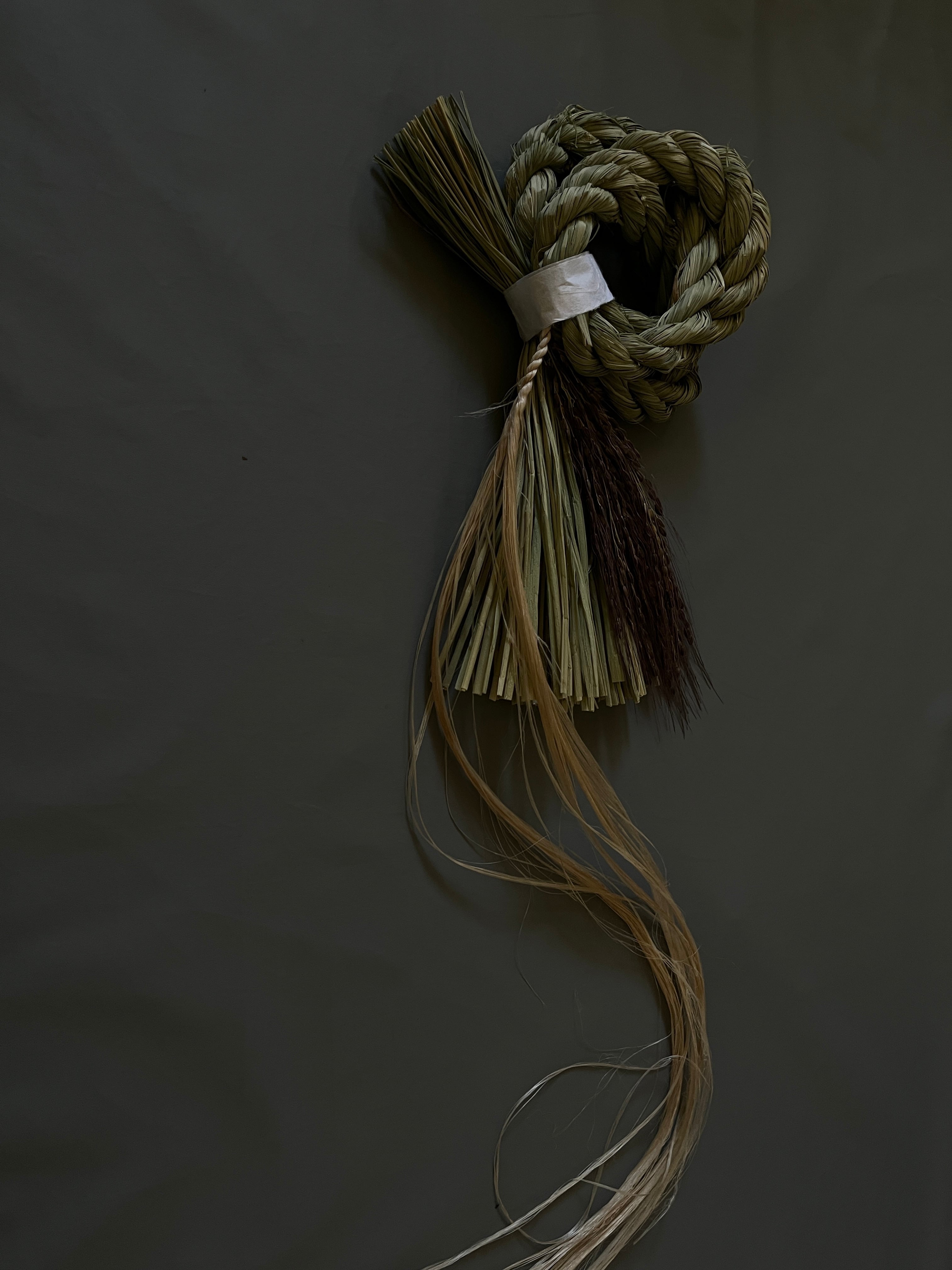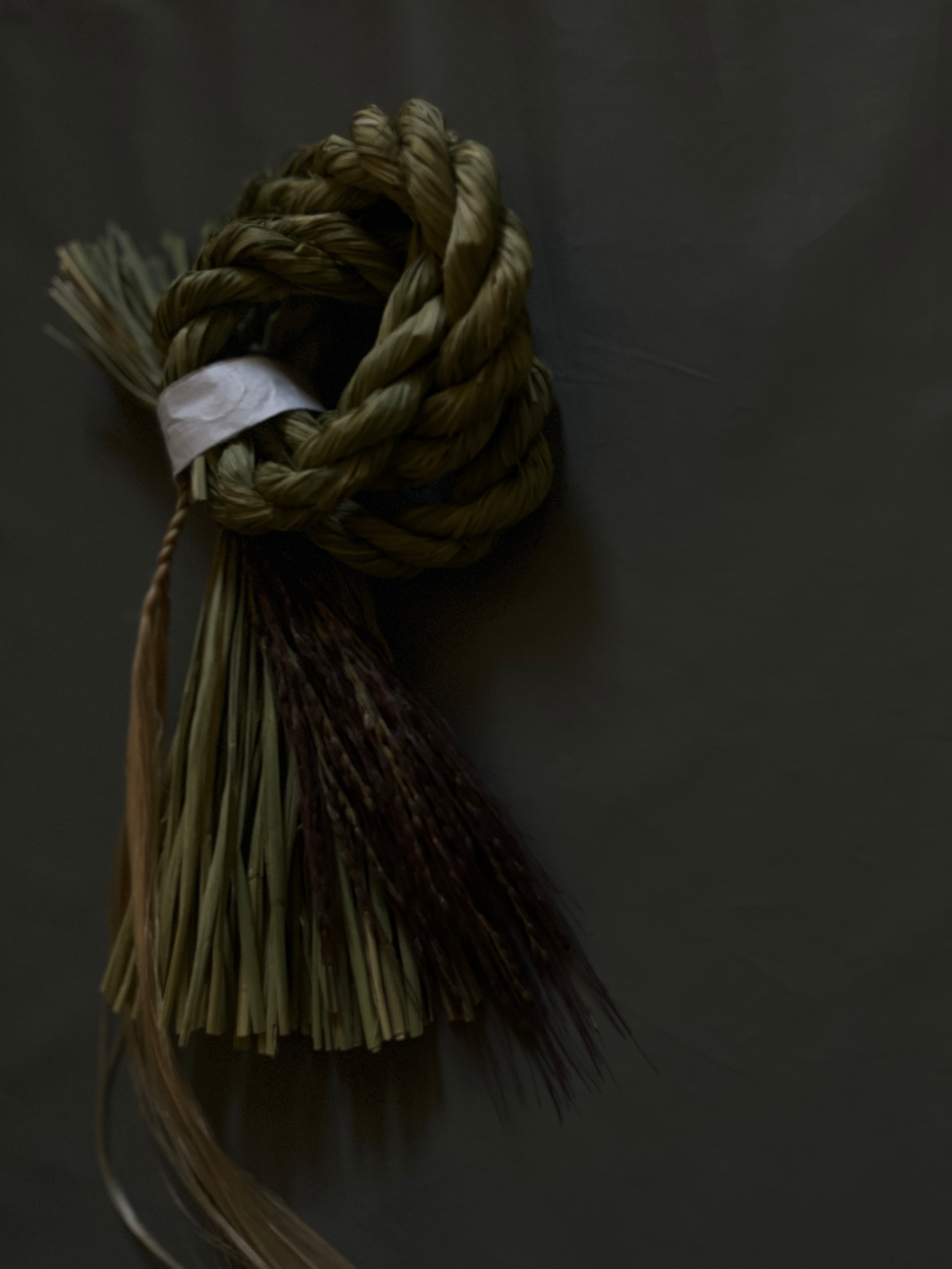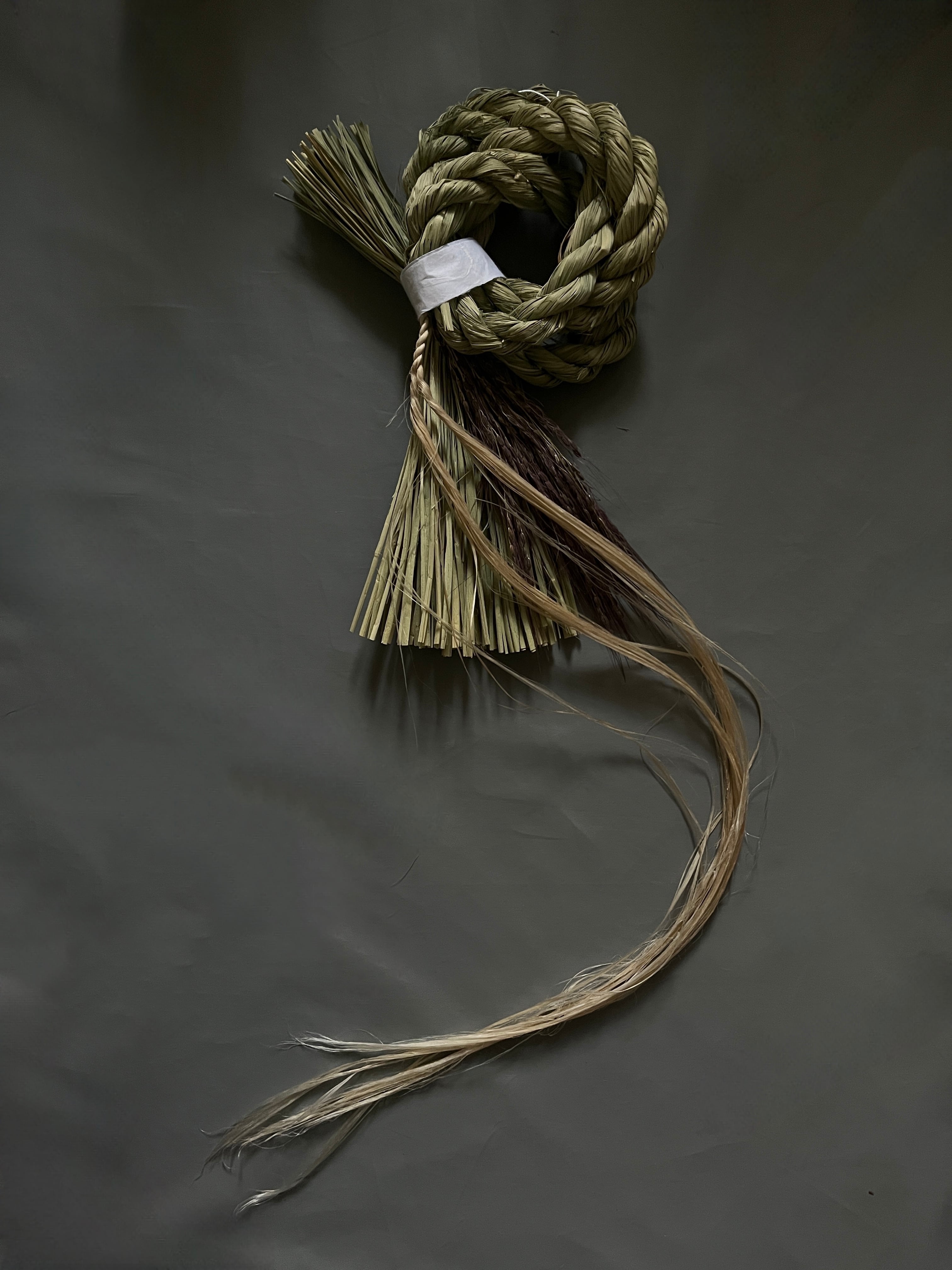 わらの美しい光沢と、深みのある古代米の素材感、垂れ下がる精麻を活かした