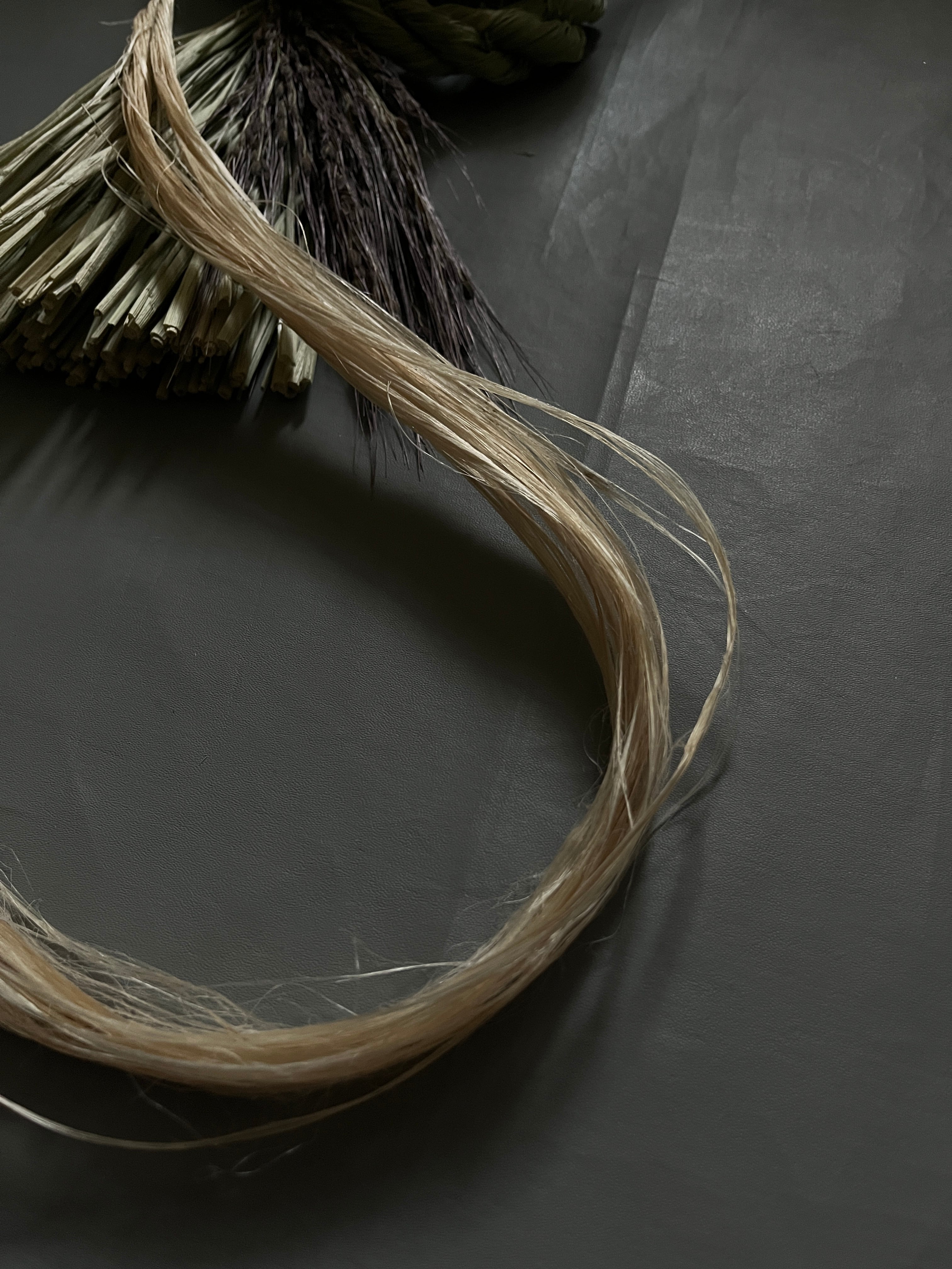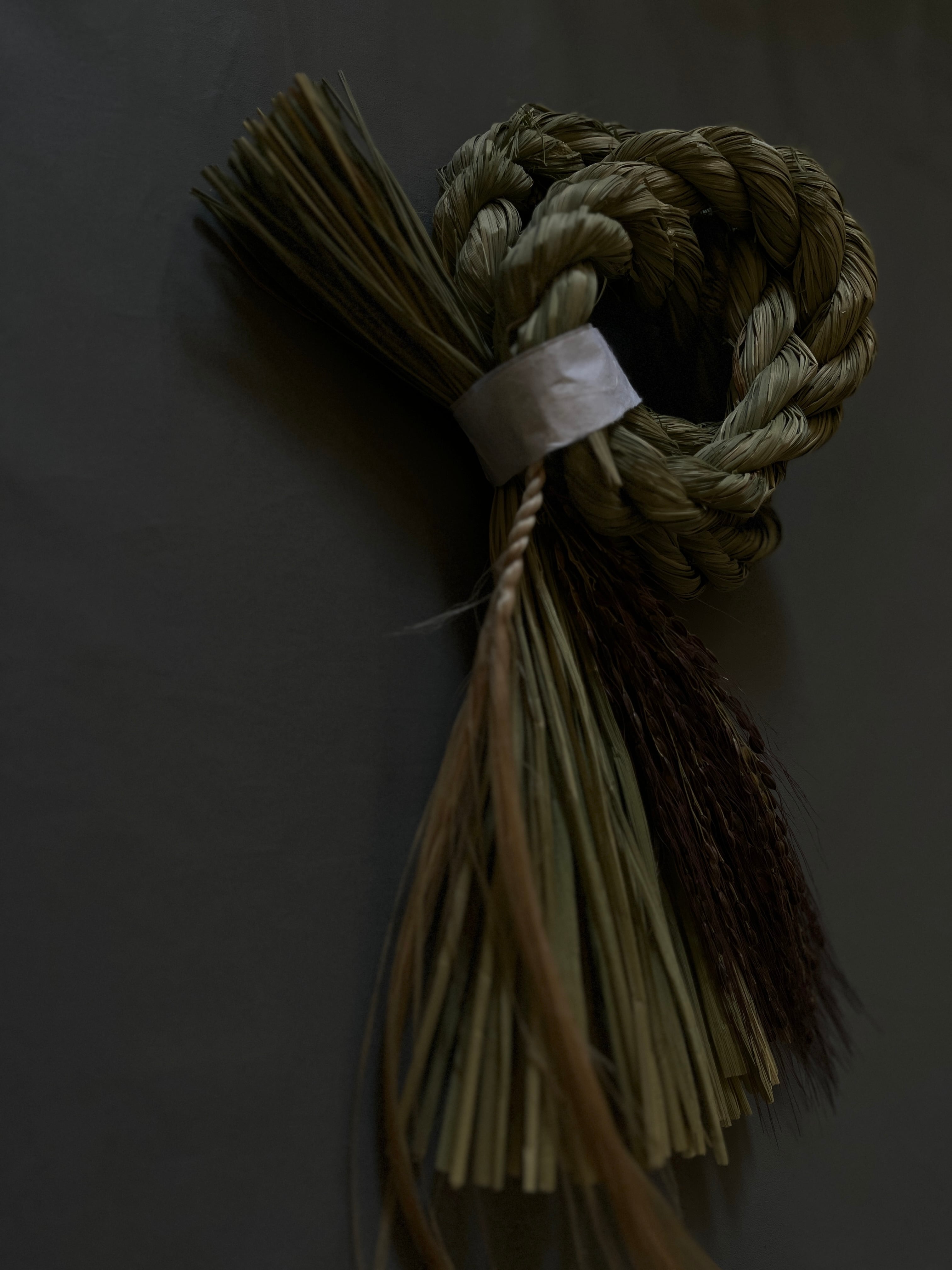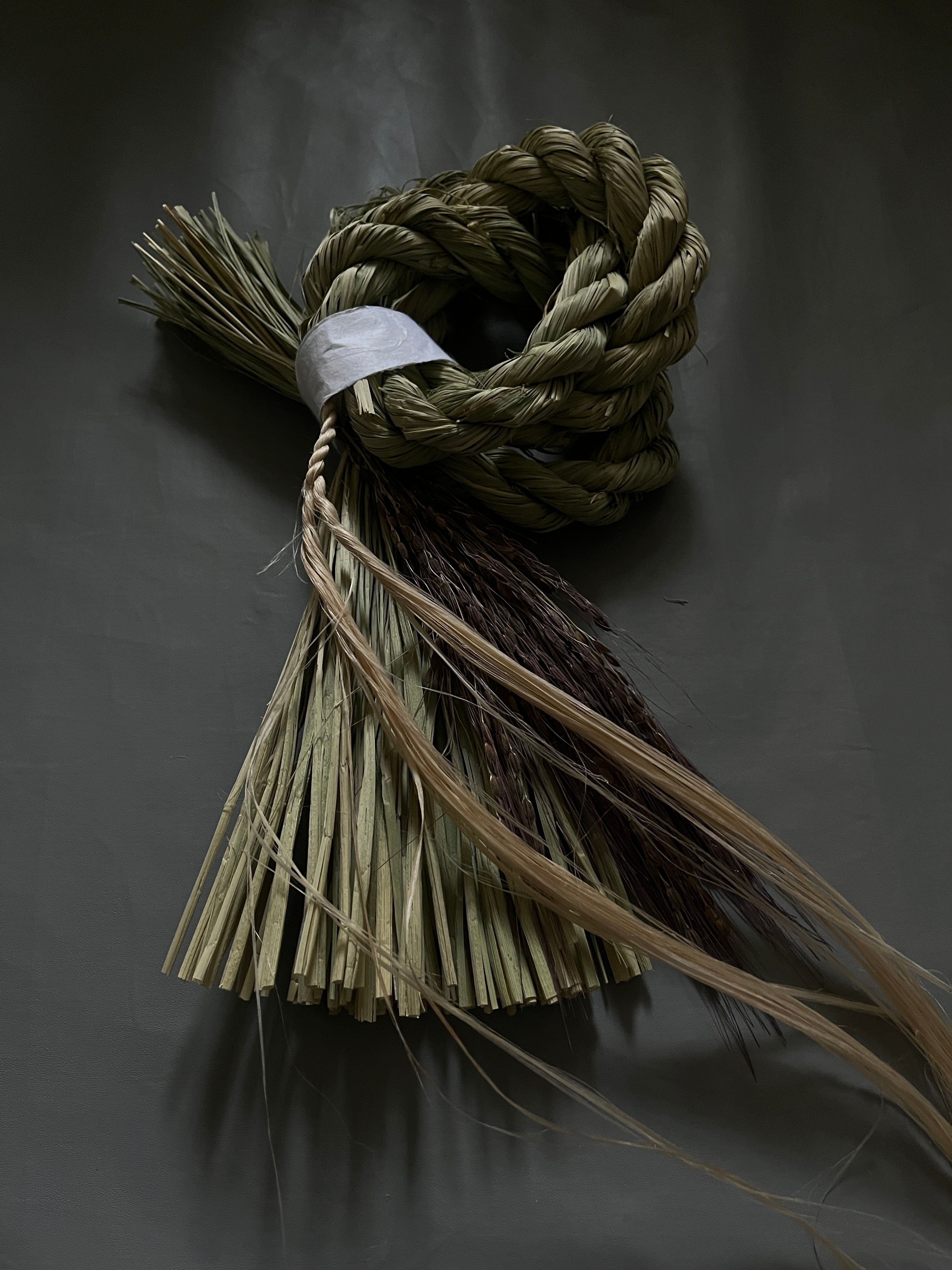 わらの美しい光沢と、深みのある古代米の素材感、垂れ下がる精麻を活かした