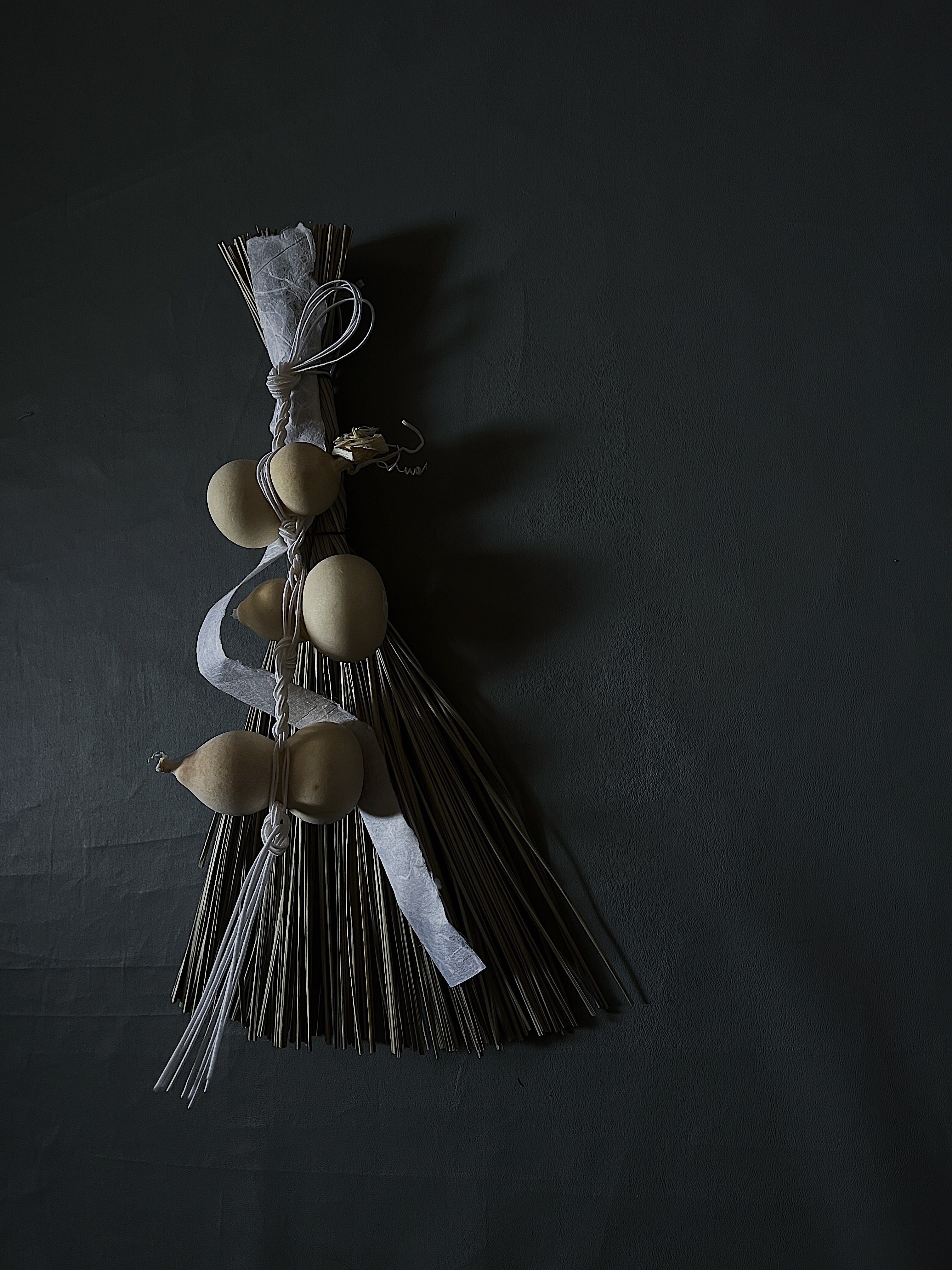 手漉きの和紙を敷き、長野の水引で縄を編み、その中に瓢箪を連ねました