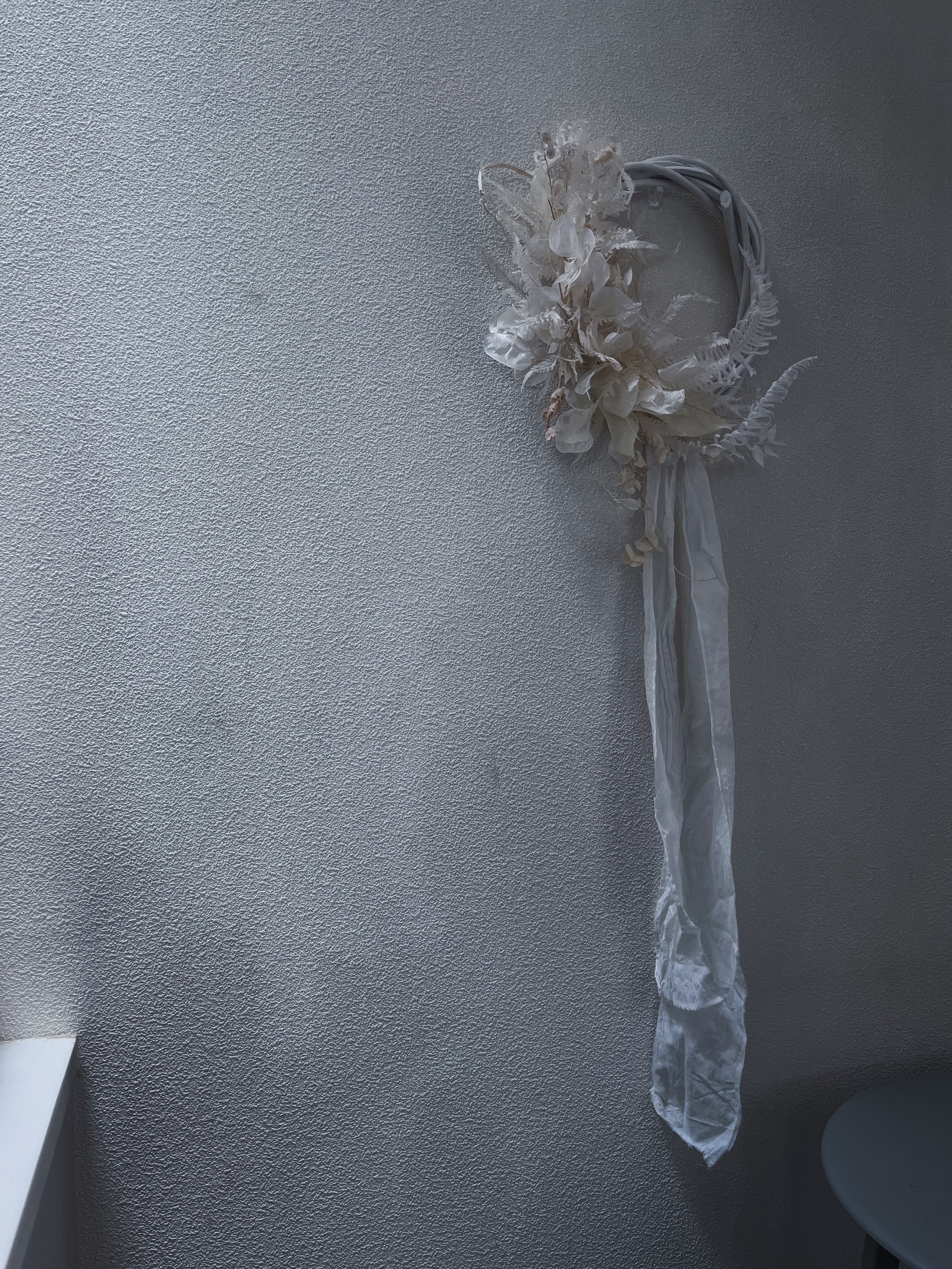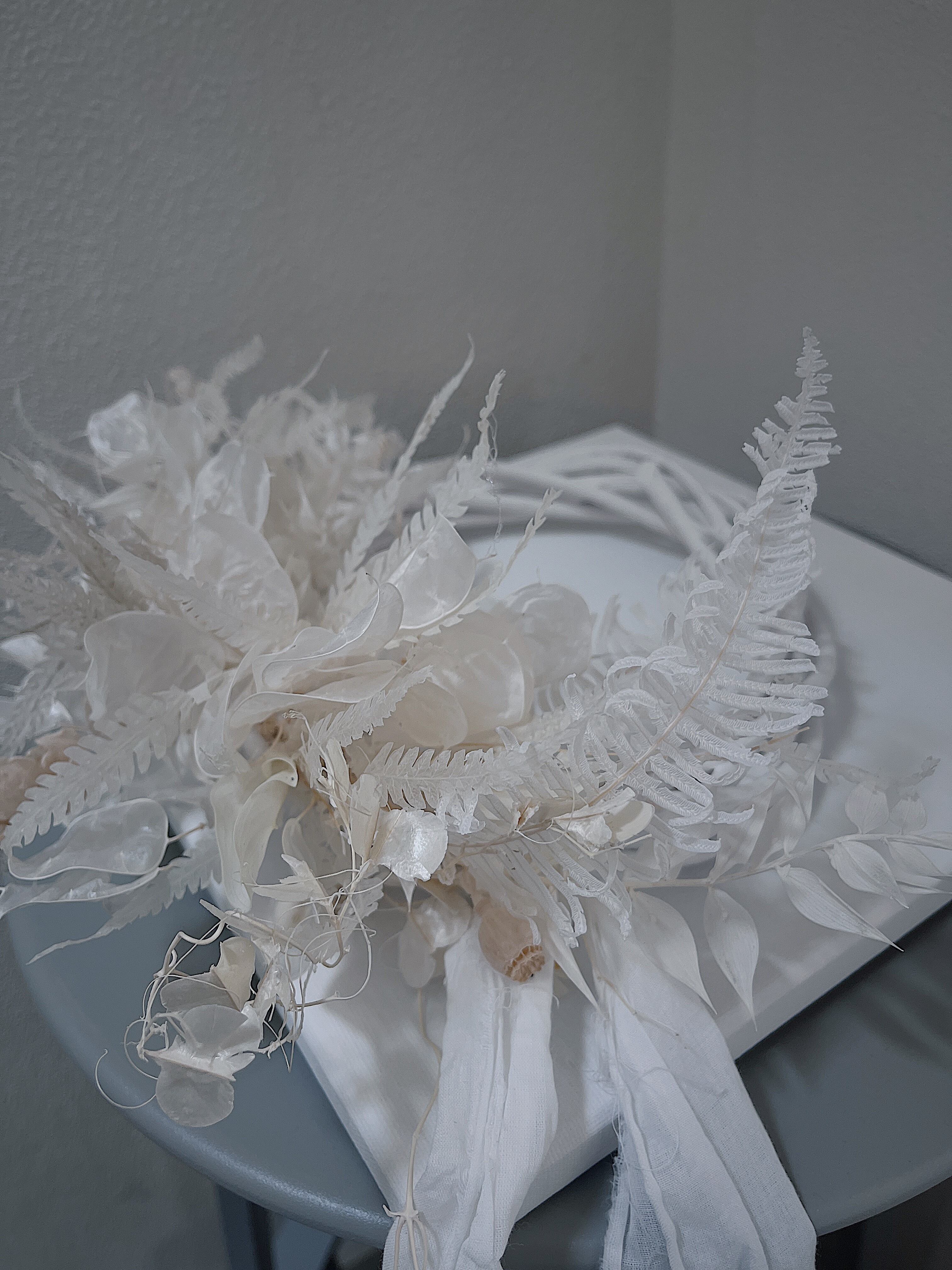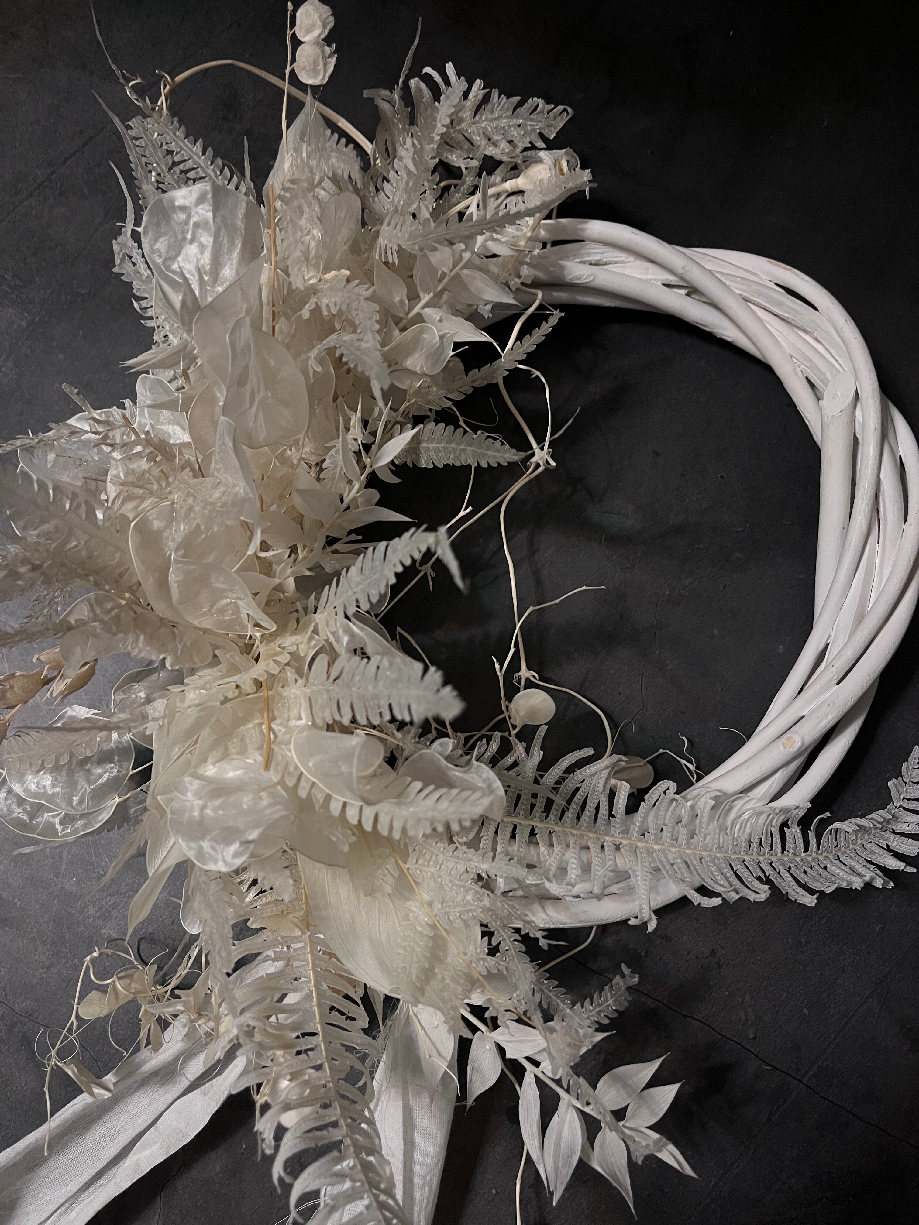 柳のホワイトリースベースにルナリアと透明感のある植物を